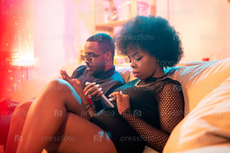 Два молодых серьезных миллениалов африканской этнической принадлежности, отправляющих текстовые сообщения со смартфонов