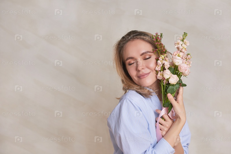 Горизонтальный студийный портрет очаровательной молодой женщины, держащей красивый букет цветов с закрытыми глазами, копирование пространства