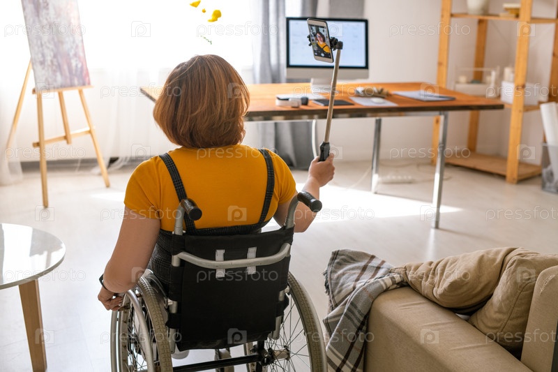 Обратный вид молодой современной женщины в инвалидном кресле, передвигающейся по новому дому