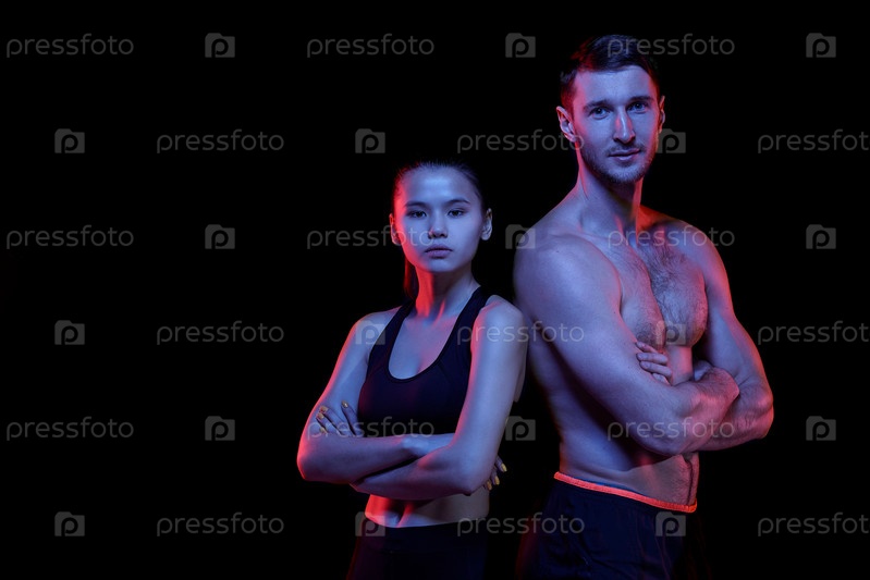 Два молодых спортивных мужчины и женщина в активной одежде, скрестившие руки за грудь