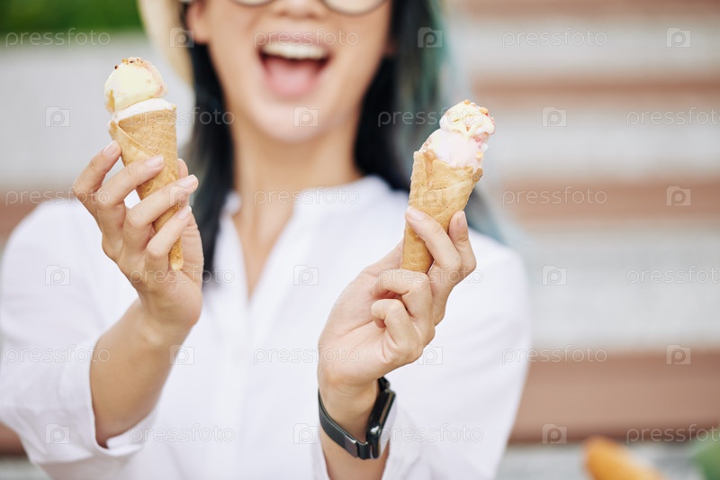 Женщина показывает мороженого конусов