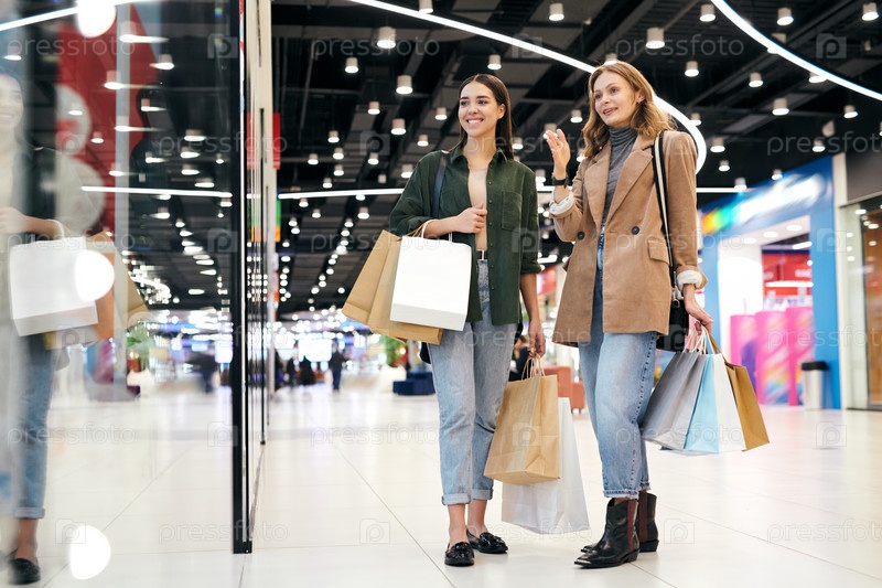 Две молодые дружелюбные женщины в повседневной одежде стоят у витрины магазина в торговом центре