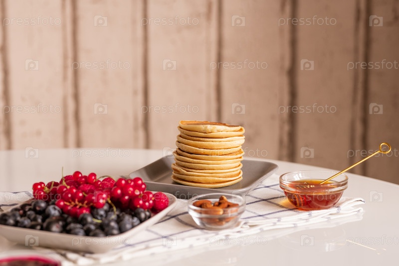 Куча небольших домашних блинчиков, свежеспелых красных смоковниц и черников