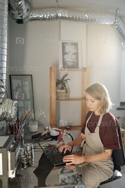 Серьезная молодая творческая женщина в фартуке общаться за столом в мастерской или студии