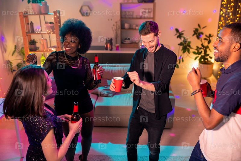 Молодые экстатические межкультурные друзья с напитками танцуют на домашней вечеринке