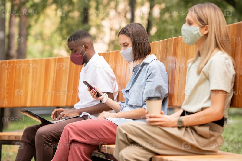 Молодая брюнетка в защитной маске прокручивает смартфон на скамейке