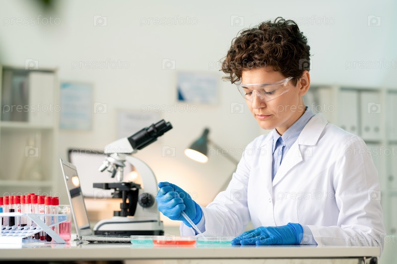 Молодой химик в перчатках, белом халате и очках берет образцы веществ