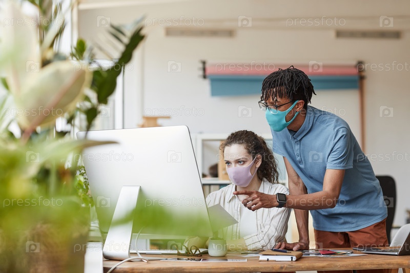 Творческие молодые люди, носящие маски в офисе