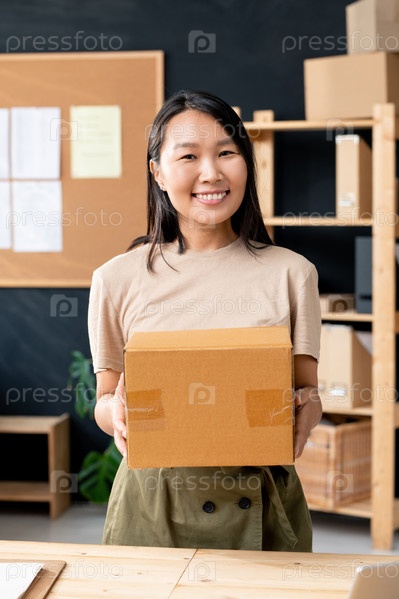 Молодой веселый работник офиса онлайн-магазина с коробкой, стоящей у рабочего места