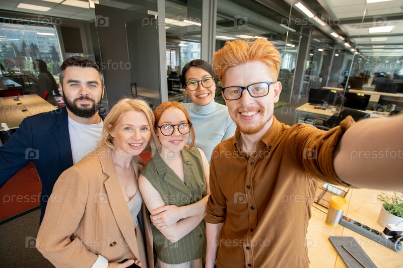 Группа успешных офисных работников с зубчатой улыбкой, делающих селфи в офисе