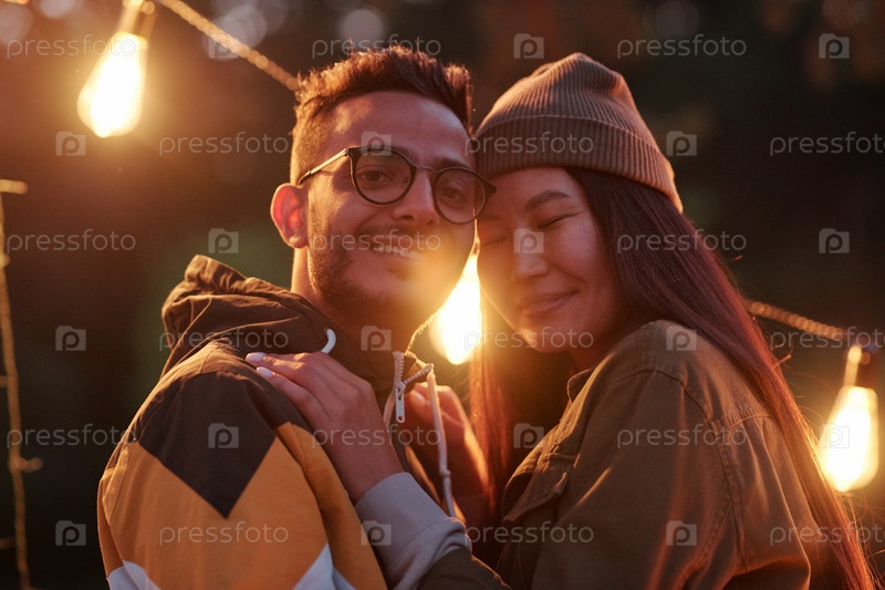 Счастливая молодая любящая пара в повседневной одежде отдыхает вечером