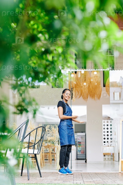 Женщина, приглашающая клиентов в своем кафе