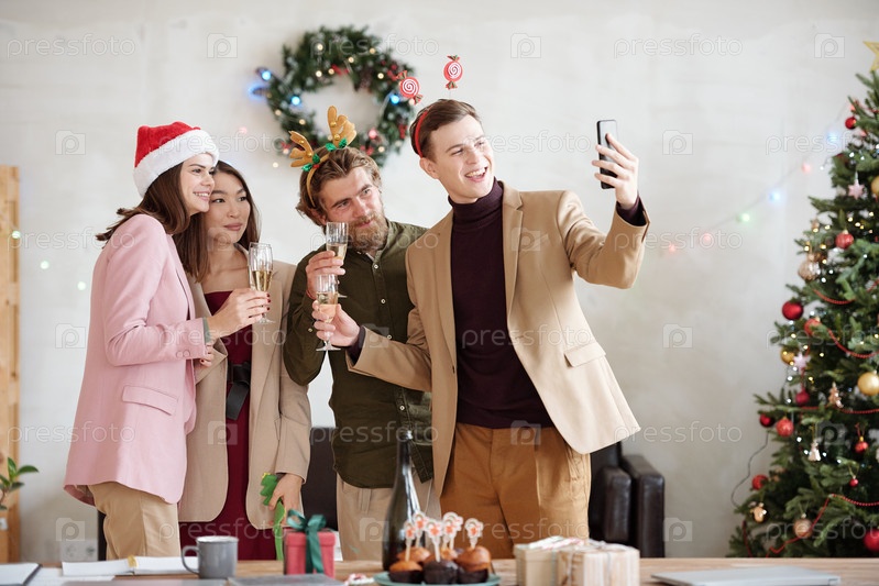 Группа молодых деловых партнеров с флейтами шампанского делают селфи