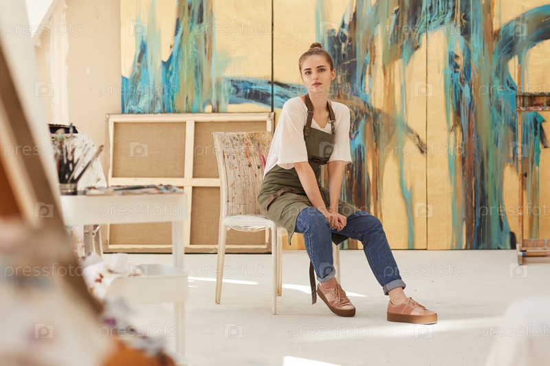 Женщина-художница позирует в современной мастерской