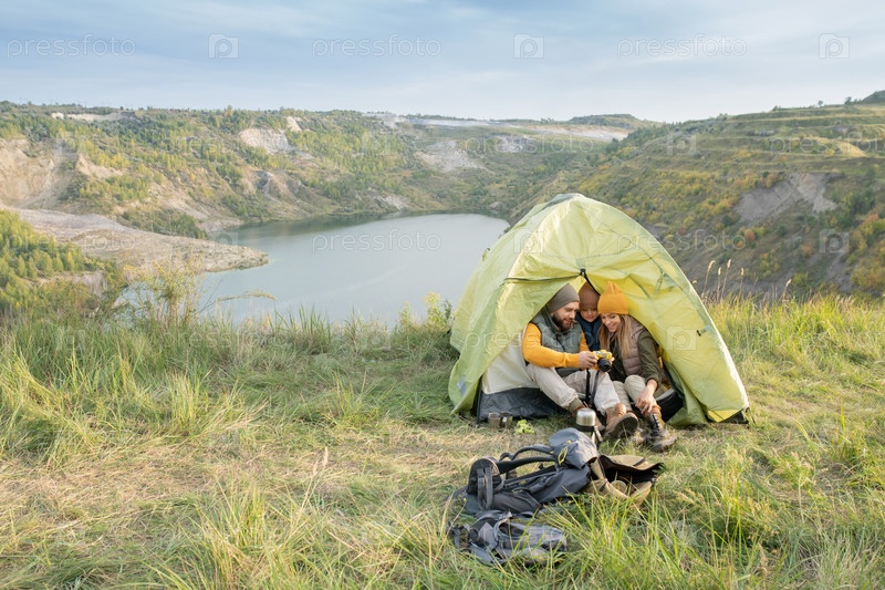 Молодой человек с фотоаппаратом показывает фотографии своему маленькому сыну и жене в палатке