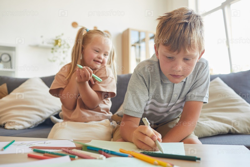 Брат и сестра рисуют вместе дома