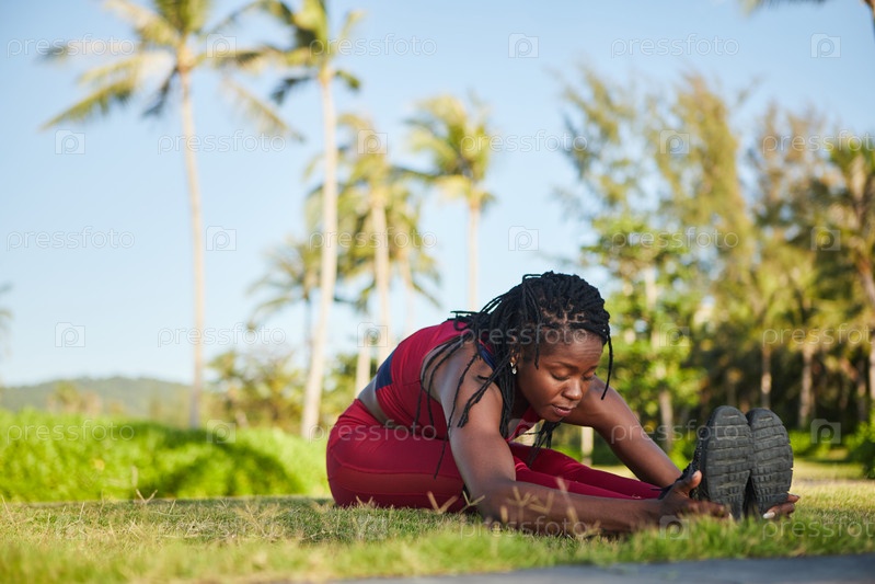 Спортсменка, растягивающая бедренные суставы