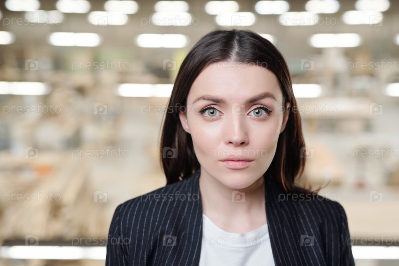 Молодая серьезная брюнетка - менеджер по продажам современной мебельной фабрики