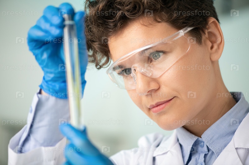 Молодая исследовательница в перчатках, очках и белом халате изучает субстанцию