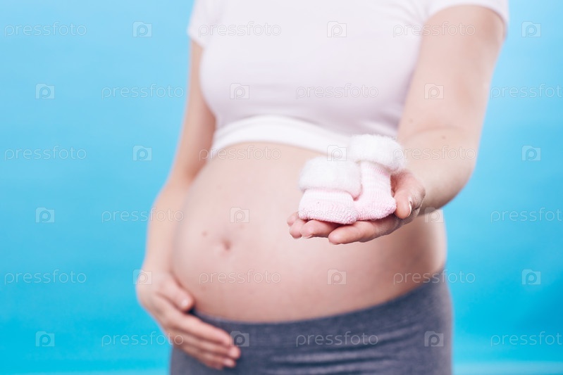 Рука молодой беременной женщины, показывающей вам пару крошечных теплых вязаных носков