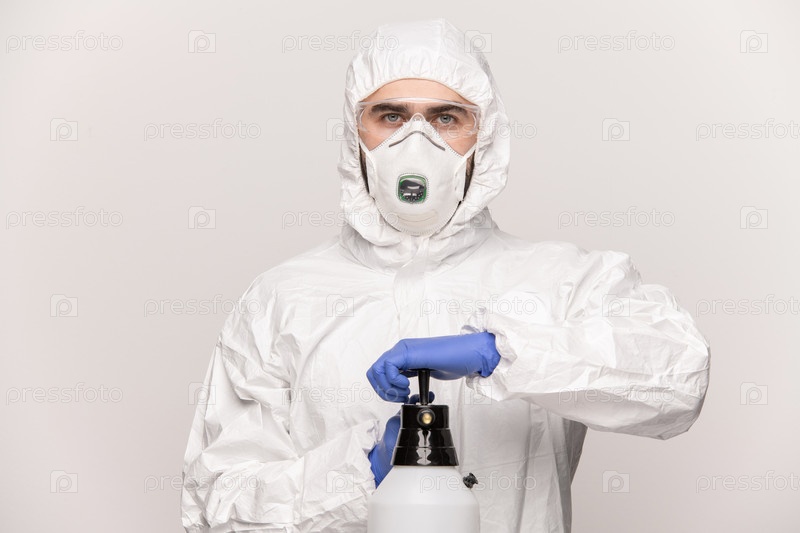 Работник биотехнологической лаборатории в защитной рабочей одежде толкает диспенсер