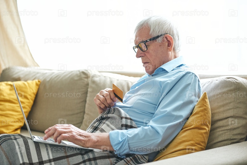 Оставшийся на пенсии седой мужчина, обернувшийся в ковры, отдыхает на диване и делает покупки онлайн