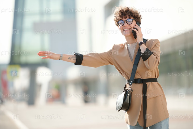 Молодая улыбающаяся женщина со смартфоном консультирует клиента по телефону на дороге