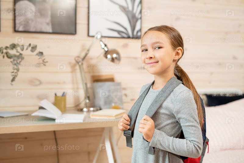 Современная счастливая школьница с рюкзаком, стоящая перед камерой