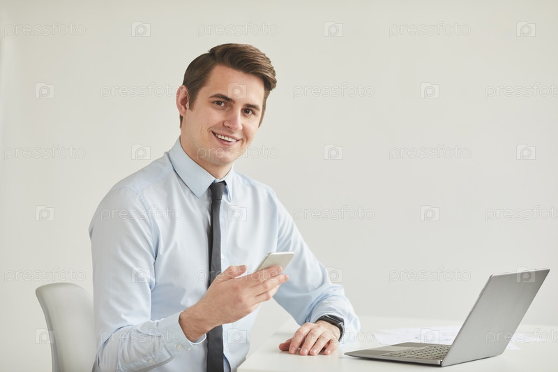 Улыбающийся бизнесмен на рабочем месте в Белом офисе