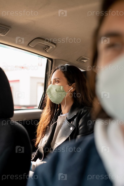 Молодая брюнетка-женщина в кожаной куртке и защитной маске слушает музыку