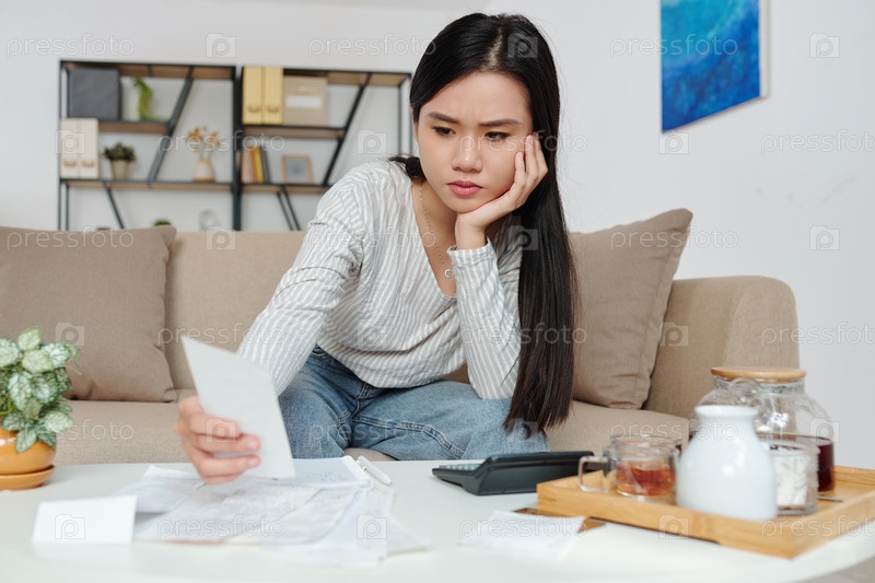 Нахмуренная женщина проверяет счета
