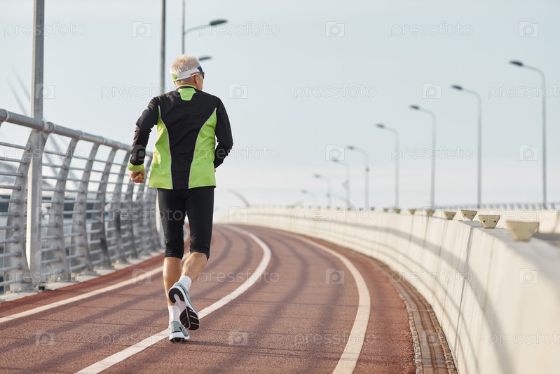 Непризнанный пожилой мужчина бежит вдоль трассы