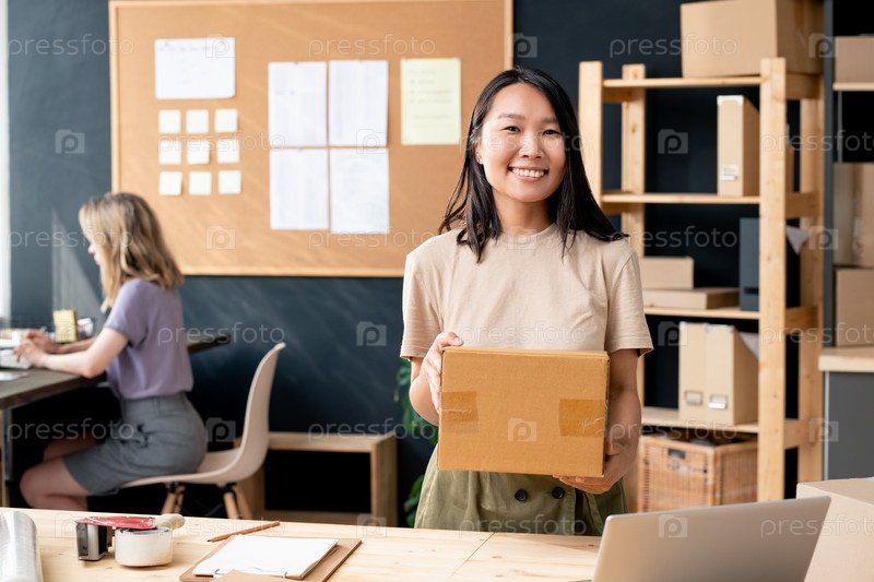 Молодая улыбающаяся женщина-работница офиса интернет-магазина с упакованной коробкой, которая смотрит на тебя