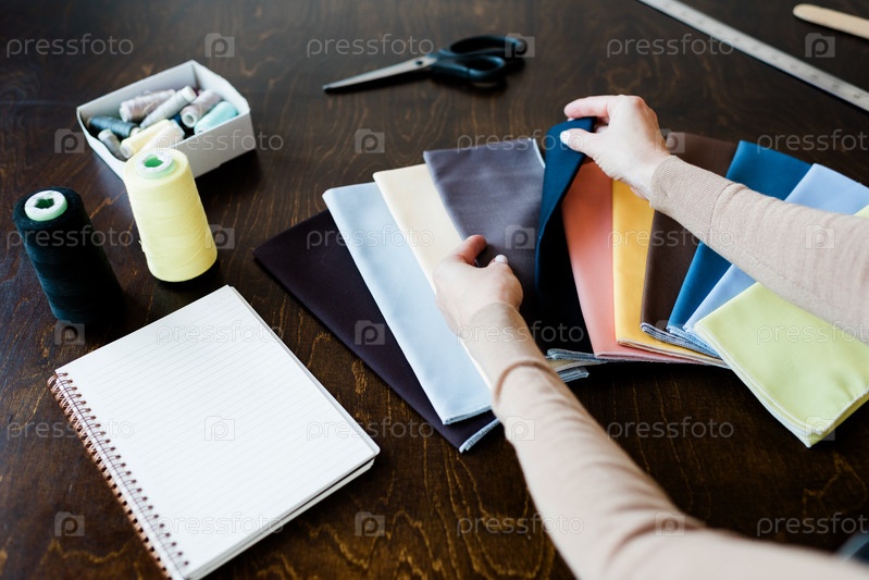 Руки женщины-модного дизайнера, смотрящей через образцы текстиля на столе