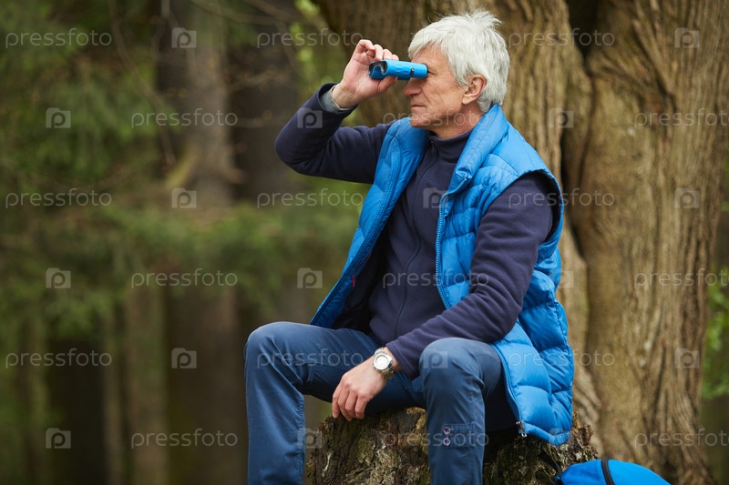 Пожилой мужчина смотрит в бинокль во время активного похода