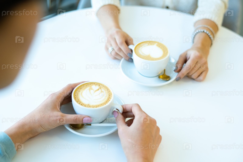 Руки двух дружелюбных девушек, получающих свежее вкусное капучино во время общения