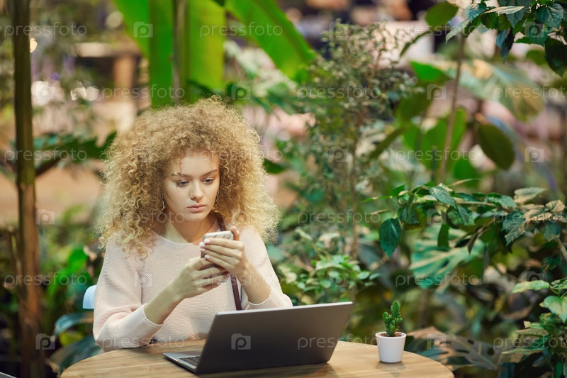 Молодая женщина работает онлайн в кафе