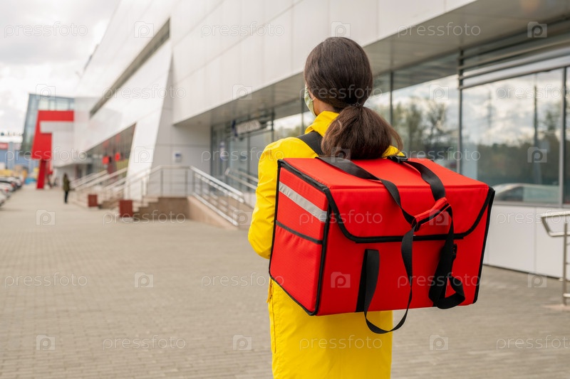 Задний вид молодой курьерки, несущей большой красный пакет с заказами клиентов