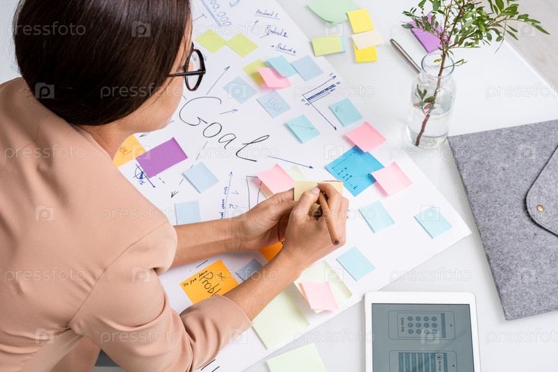 Молодая брюнетка-бизнесменка делает заметки на бумаге над большим документом
