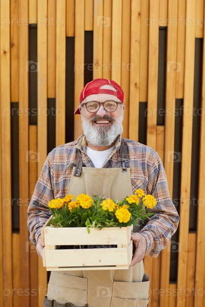 Старший садовник держит коробку с цветами