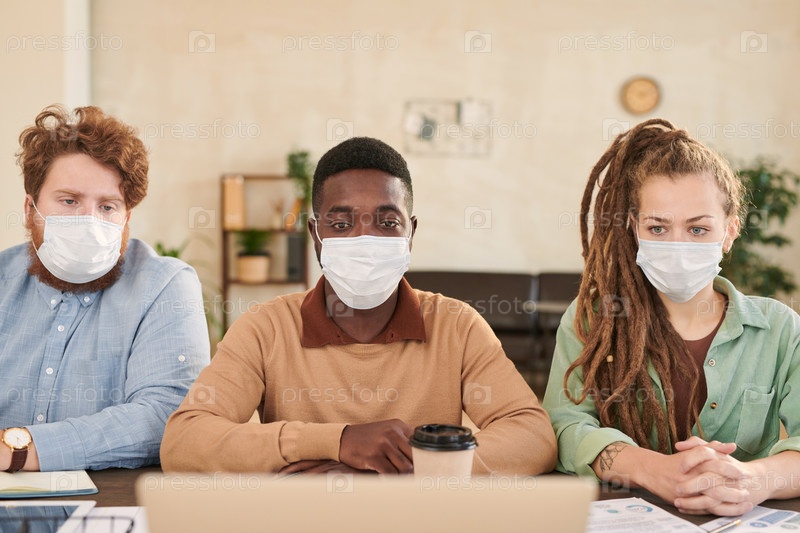 Группа серьезных молодых мультиэтнических коллег в масках для лица, сидящих за столом и смотрящих вебинар на ноутбуке в офисе во время пандемии коронавируса