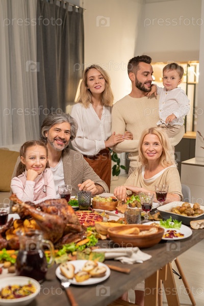 Большая семья из трех поколений, сидящая за столом с разнообразной едой