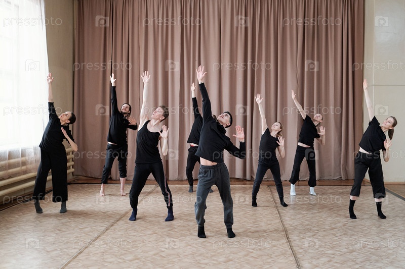 Молодой тренер по танцам показывает упражнения группе из нескольких парней и девушек