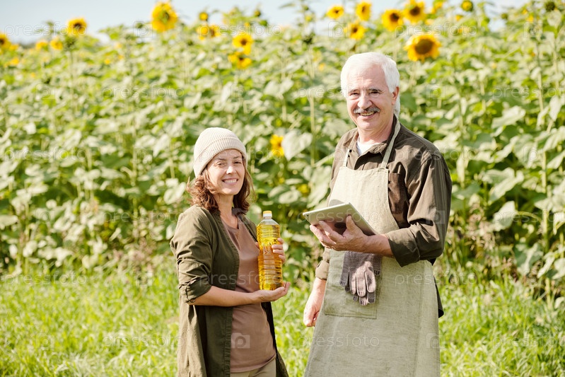 Счастливый старший фермер и его зрелая коллега с бутылкой масла
