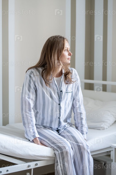Молодая блондинка-пациент современного ковидного госпиталя, ожидающая посетителей
