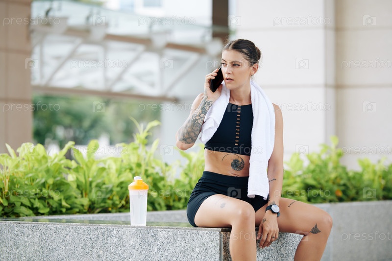 Фитная женщина, разговаривающая по телефону