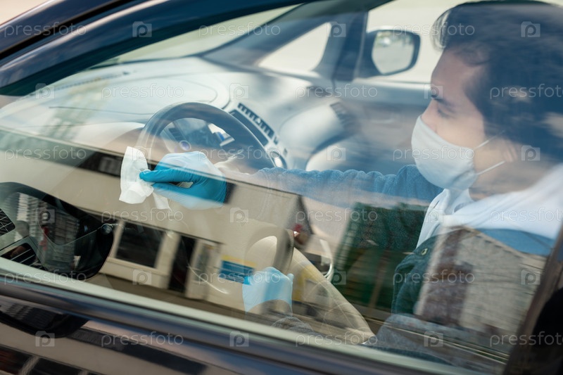 Молодой человек в перчатках с маской чистит бык машины мокрым антисептическим полотенцем