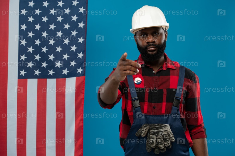 Строитель африканской этнической принадлежности в жесткой шляпе, комбинезоне и фланелле указывает на вас