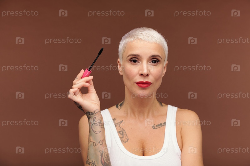 Зрелая блондинка с татуировками на руках и груди, красная помада на губах