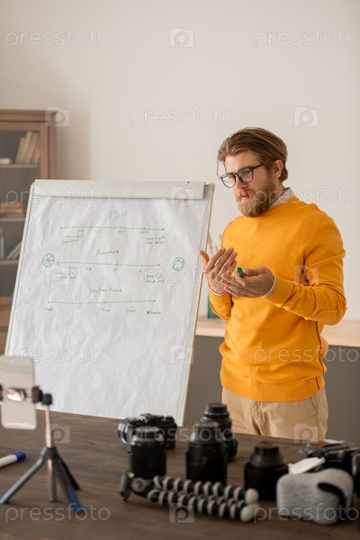Уверенная в себе молодая учительница стоит у доски перед камерой смартфона